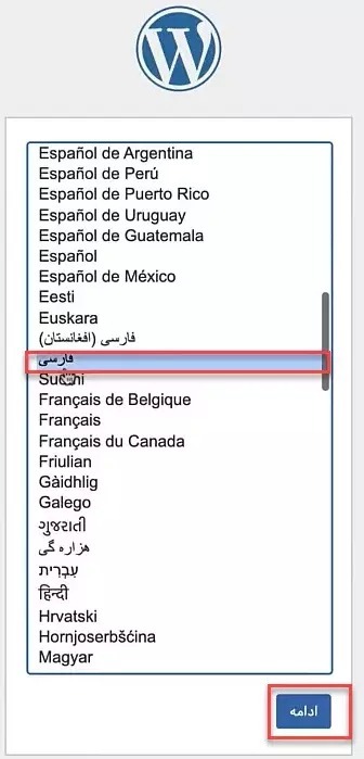 همه مراحل را انجام داده اید و تقریبا کار به اتمام رسیده؛ دیتابیس نیز ساخته اید. حالا تنها نیاز است تا آدرس سایت را بزنید و آن را باز کنید. پنجره زیر نمایش داده می شود و باید زبان خود را انتخاب نمایید دکمه ادامه را کلیک کنید.